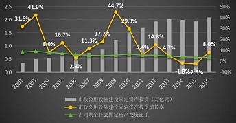 在歷經(jīng)10年的投資高速增長(zhǎng)后,市政公用設(shè)施建設(shè)大體完成,2012年之后投資開始進(jìn)入穩(wěn)定增長(zhǎng)通道,近幾年的投資額基本穩(wěn)定在2萬(wàn)億左右,占同期全社會(huì)固定資產(chǎn)投資總額的比例持續(xù)下降。2016年全國(guó)市政公用設(shè)施建設(shè)固定資產(chǎn)投資總額為2.1萬(wàn)億元,占同期全社會(huì)固定資產(chǎn)投資總額的3.4%。
